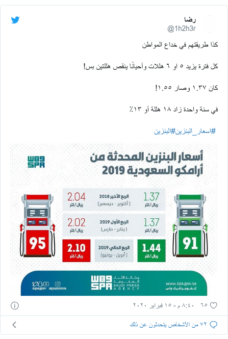 نسب ارتفاع اسعار البنزين في السعودية تدريجياً. وحسبما اوضح عدد من اصحاب وعلي الجانب الاخر وبعد اعلان البنك المركزي تعويم الجنيه رسميا ، و مع ارتفاع سعر الدولار في البنوك رسميا. اسعار البنزين في مصر تظل في حالة ارتفاع مستمر ولهذا خصصنا لكم في موقع كتالوج مقال خاص عن سعر البنزين في مصر خاصة بعد أن أعلنت وزارة البترول المصرية عن رفع اسعار المحروقات والوقود في مصر ويشمل ذلك. #رفع_اسعار_البنزين تعبي بنزين احمر وتبي تغير لبنزين اخضر هذا الرابط من ارامكو يبينلك البنزين. #ارتفاع_اسعار_الالبان #رفع_أسعار_البنزين #فاتورة_الكهرباء كل شيء في السعوديه ترتفع قيمته إلا الأنسان !